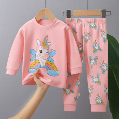 Otroška pižama z enorogom in mavrico – 2-delni komplet Popolna izbira za male sanjače in ljubitelje čarobnega sveta! Ta 2-delni komplet pižame bo razveselil vsako deklico: Majica z dolgimi rokavi v nežni roza barvi z velikim potiskom prikupnega enoroga s krili, mavrico in zvezdicami. Idealna za pravljične sanje! Hlače z elastičnim pasom, polne barvitega potiska…