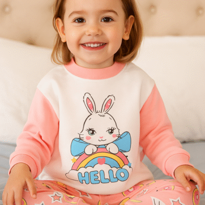 Otroška pižama z zajčkom in pisanimi motivi – 2-delni komplet Naj bo večer poln topline in zabave z nežno in igrivo pižamo za otroke! Komplet vključuje: Majico z dolgimi rokavi v beli in lososovi barvi z velikim potiskom prisrčnega zajčka, mavrice in napisom »HELLO«. Mehki patenti na rokavih in gumbi ob ovratniku olajšajo oblačenje. Ujemajoče…