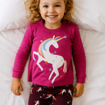 Otroška pižama z belim samorogom – 2-delni komplet Pižama, ki bo navdušila vse male ljubiteljice samorogov! Ta čarobni komplet je popolna izbira za udobne in sanjske večere. Majica z dolgimi rokavi v živahni ciklamni barvi s čudovitim potiskom belega samoroga z mavrično grivo in rogom, obdana z zvezdicami – prava paša za oči! Hlače v…