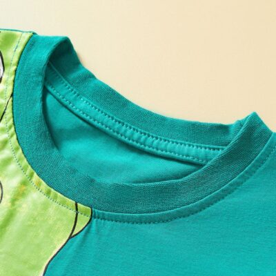 Ta komplet otroških oblačil je igriv in barvit, idealen za poletne dni. Vključuje: Zgornji del (majico s kratkimi rokavi): Svetlo turkizne barve s potiskom dveh risanih dinozavrov. Večji dinozaver je postavljen na levo stran majice in sega tudi čez rokav, manjši pa se nahaja na spodnjem desnem delu. Oba imata široko odprta usta z ostrimi…